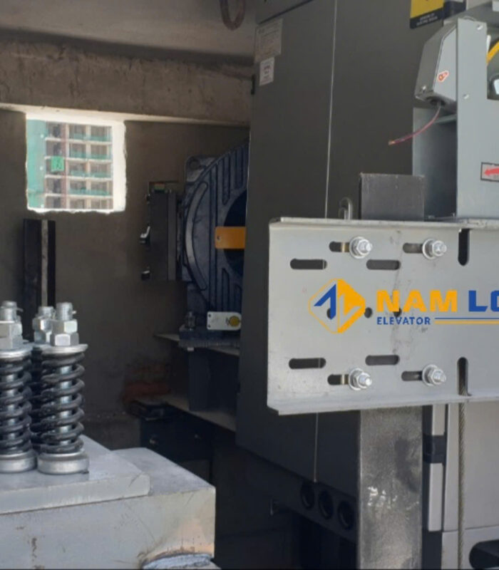 Đội kỹ thuật lắp đặt khung, ray, cabin, máy kéo và hệ thống điều khiển.