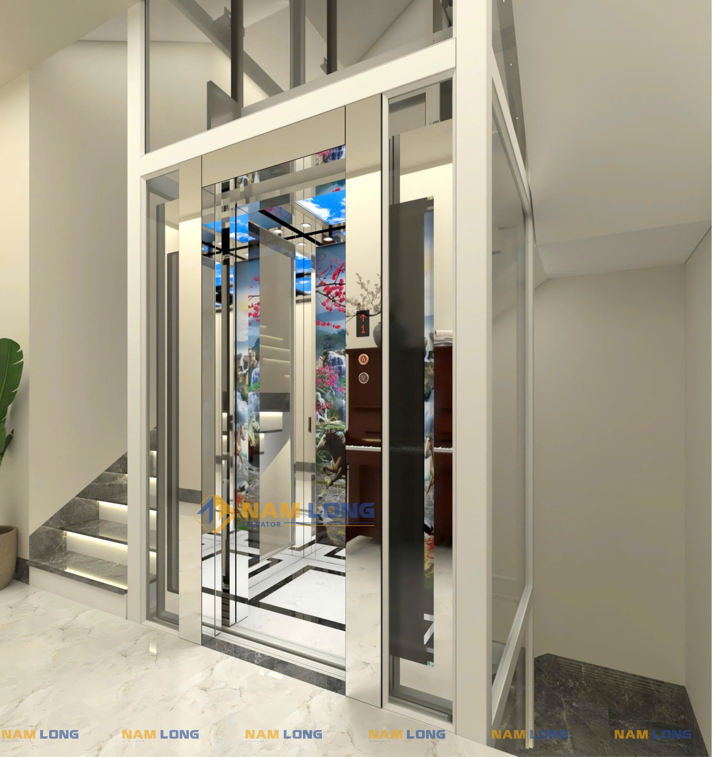 - Cửa tầng: Có thể chọn cửa mở lùa hoặc mở tự động tùy diện tích sảnh. Nhà nhỏ thường dùng cửa mở lùa để tiết kiệm không gian.